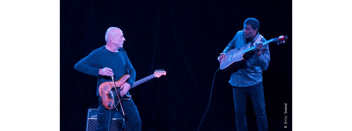 Camel Zekri et Serge Teyssot-Gay forment un duo où la guitare devient boussole et terrain d’orage. De l’ancestral au contemporain, ils tissent des transes électriques : pulsations sahariennes, feedbacks sculptés, silences habités. Zekri déplie les modes et les rythmes comme des cartes stellaires ; Teyssot-Gay taille des lignes de fuite, urgentes, vibrantes. Ensemble, ils ouvrent des passages : une musique de rencontre, d’instant, qui joue de l’espace, du temps et du présent aux jeux à sommes non nul…