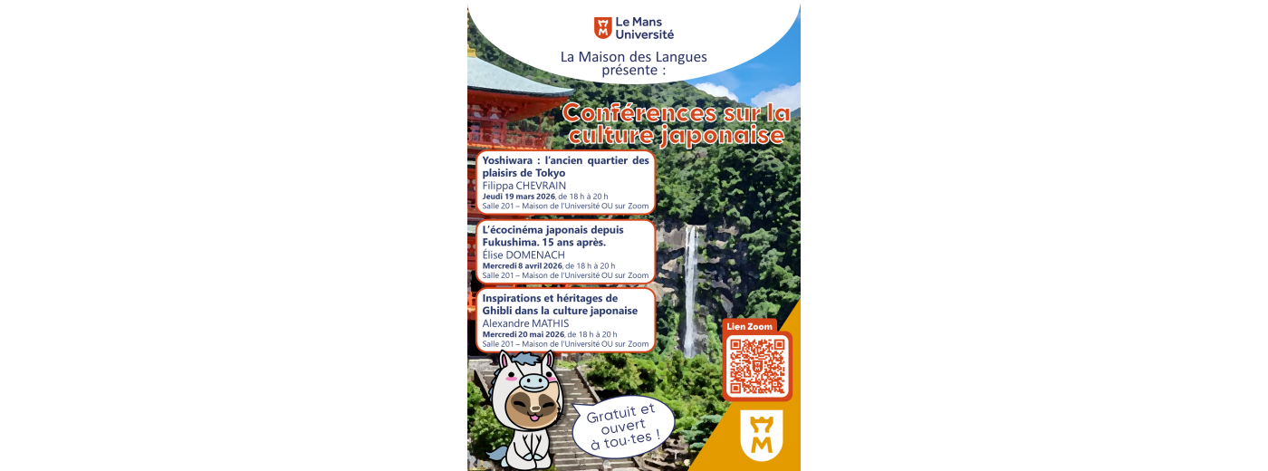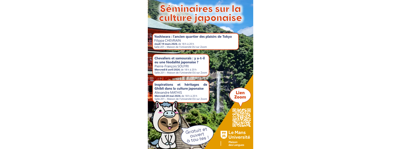 La Maison des Langues de Le Mans Université propose une série de séminaires consacrés à la langue et à la culture japonaise. Ces rendez-vous invitent à découvrir différents aspects de l’histoire, de la société et de l’imaginaire japonais, à travers le regard de spécialistes.
