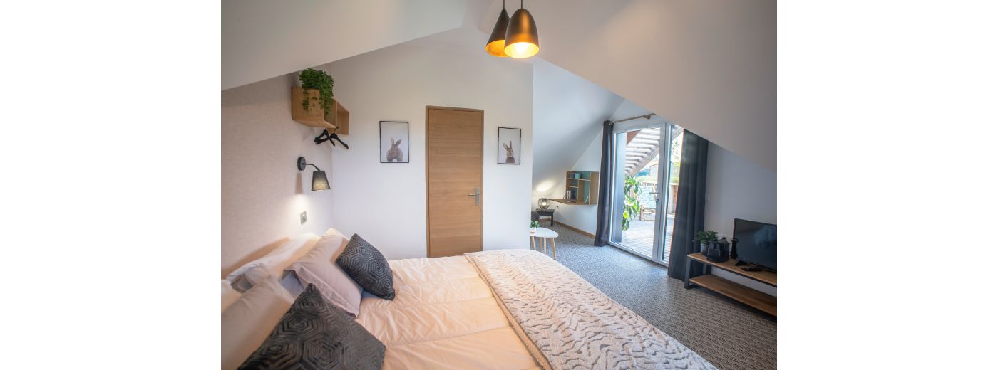 • 1 Appartement de 2 chambres pour 4 personnes climatisé ( lits twins ou lits doubles à la demande) dont 1 chambre PMR / salle d’eau PMR/ WC.