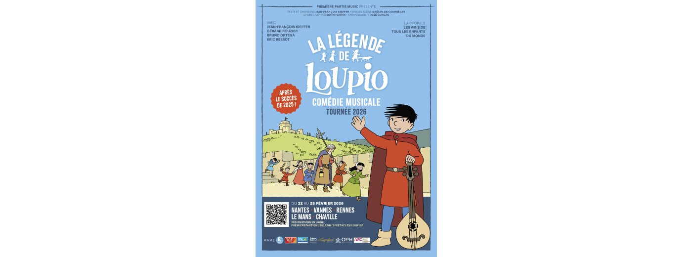 Première Partie Music présente "La Légende de Loupio". Spectacle Jeune Public. Après un succès en 2025, le spectacle Loupio repart en tournée en 2026 ! Connaissez-vous Loupio, le héros de bande dessiné créé par Jean-François Kieffer ? Ce jeune troubadour orphelin a déjà conquis le cœur de millions de lecteurs avec ses aventures pleines de courage et de joie de vivre. Aujourd’hui, nous donnons vie à cet attachant personnage sur scène, dans une comédie musicale qui promet d’enchanter les familles. Au cours de ce spectacle, Loupio raconte aux enfants de la ville d’Assise ses rencontres extraordinaires et ses découvertes au gré des chemins. Dialogues, danses et chansons se déploient sous un décor projeté sur grand écran : de magnifiques scènes s’animent au rythme des chansons pour donner au spectateur l’impression d’être lui aussi à Assise, au temps de saint François. Les 20 chansons du spectacle sont interprétées par une équipe artistique de talent : Jean-François Kieffer lui-même – joueur de luth comme son héros –, le comédien Gérard Rouzier, treize enfants et jeunes de la chorale « Les Amis de tous les enfants du monde » (Douai) et le flûtiste-percussionniste Bruno Ortega. Cette comédie musicale laissera en chaque enfant des images inoubliables et des refrains qui ne les quitteront plus !