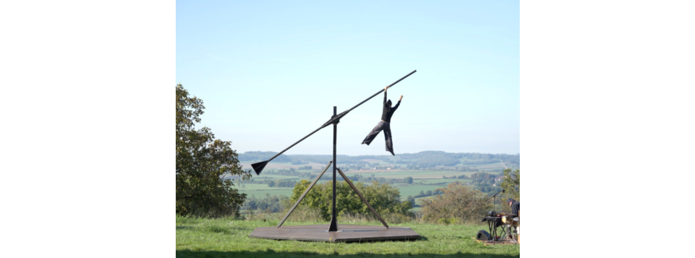 Dans Par-delà l'horizon, une acrobate oscille entre l’aérien et le terrien, entre la suspension et le funambulisme, entre la puissance et la vulnérabilité. À 7 mètres de hauteur, elle évolue sur une éolienne à deux pales, faite de métal et de bois, inspirée des sculptures d’Alexandre Calder et de Jean Clareboudt. Cette scénographie/agrès tente d’extirper l’acrobate de la gravité qu’elle subit. Elle cherche un déséquilibre entre l’acte acrobatique et une forme de grâce corporelle.